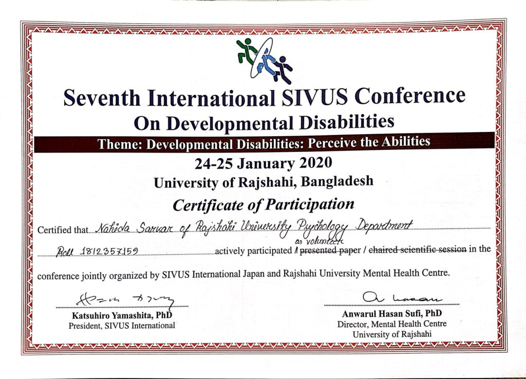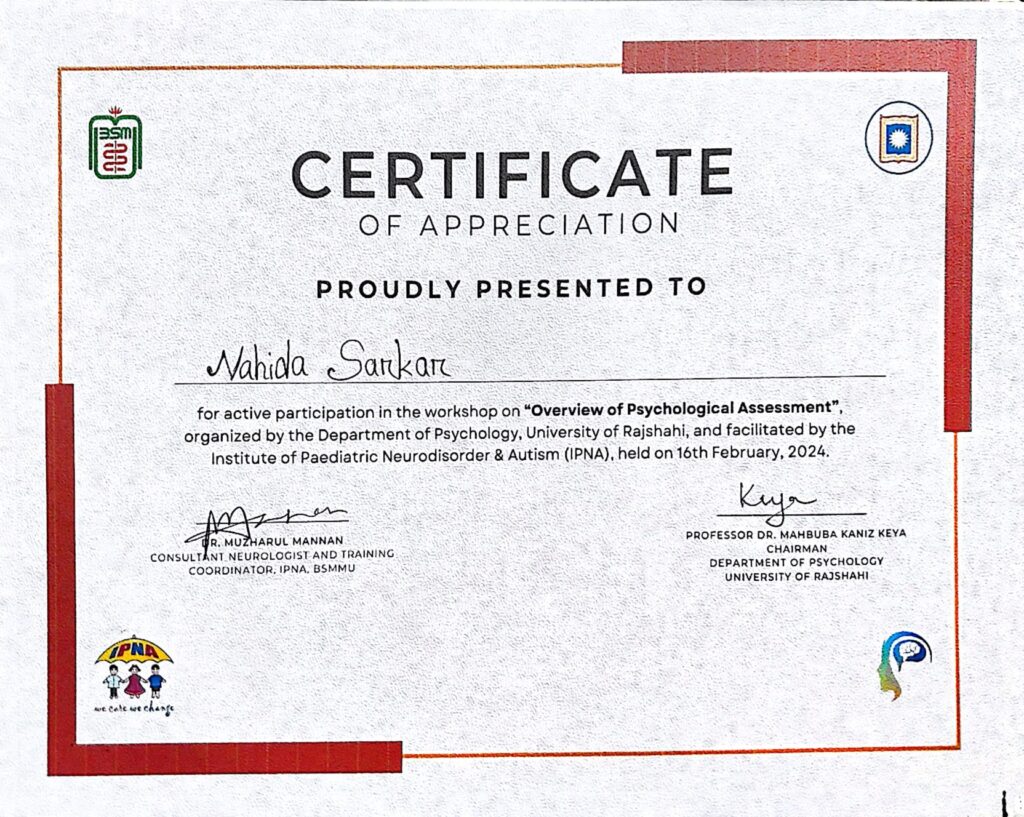 This workshop was organized by the Department of Psychology, Rajshahi University and facilitated by the Institute of Paediatric Neuro Disorder & Autism (IPNA) on 16/02/24. I have actively participated there and learned about psychological tools and their usage.